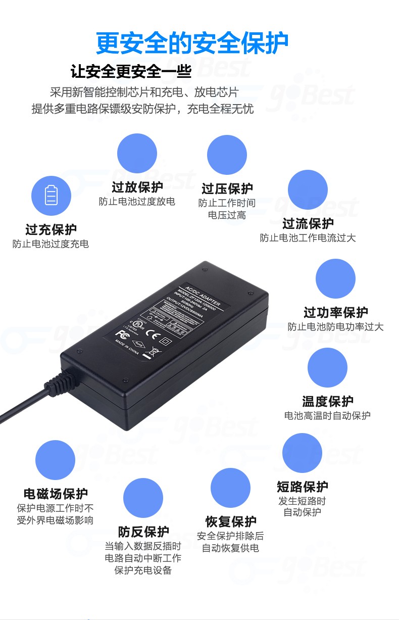 • 采用前沿IC控制方案和先進(jìn)的制造工藝,高精度,低噪音;過壓,過流,過充,短路等多重保護(hù)。